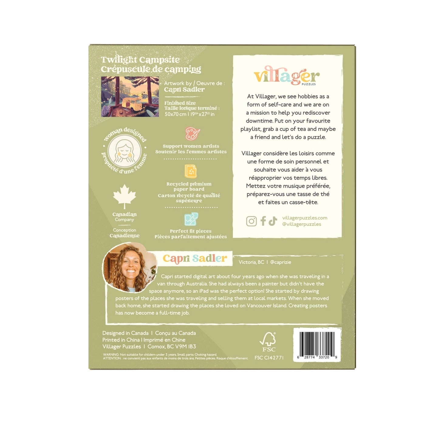 Enjoy a soft, glowing sunset over the ocean. This beautifully illustrated travel-poster-style puzzle shows a cozy camping trailer perched on a cliff, overlooking peaceful waves below. Created by Vancouver Island artist Capri Sadler, Twilight Campsite captures the magic of a camping trip at Sombrio, where the sun was setting, surfers still rode the waves, and every moment felt alive with that classic West Coast vibe.