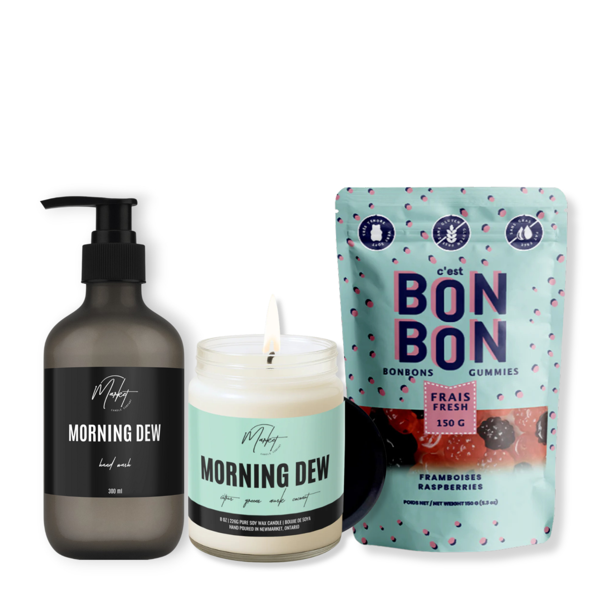 The Morning Dew candle brings soft, airy notes that brighten any space, paired with a hydrating body lotion for a subtle everyday scent. Finished with artisan gummies, this bundle adds a playful touch to your daily routine.
